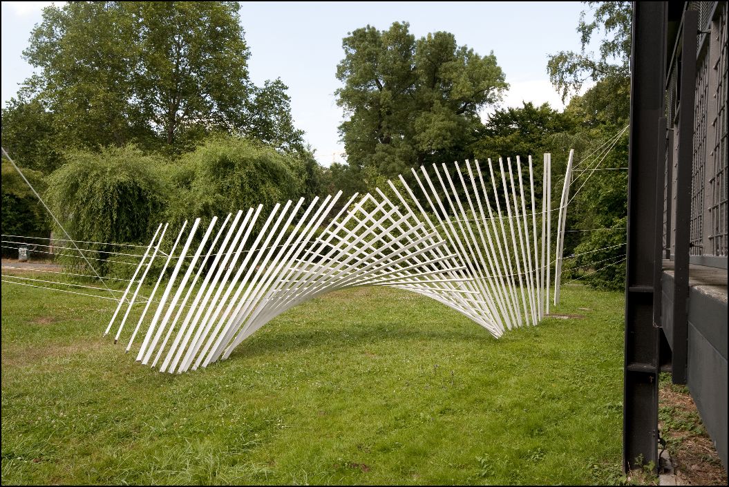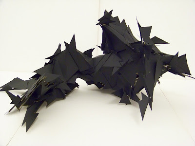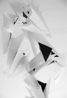Die Rauminstallation namens ,, Kluster “, basiert auf im Computer generierten geometrisch 3-Dimensionalen Objekten., die sich nach keiner erkennbaren Struktur angeordnet sind und in den realen Raum gestellt wurden.